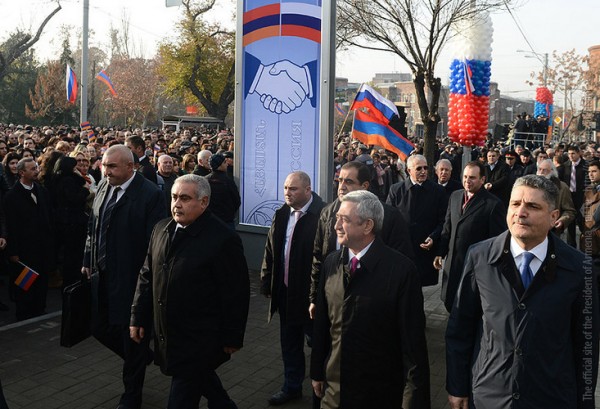 President Serzh Sargsyan attended today the opening ceremony of the Unified Cross Memorial in Yerevan which in its unique way symbolizes the centuries-long friendship of the Armenian and Russian peoples. The Memorial was unveiled by the Co-Chairs of the Armenian-Russian intergovernmental commission the Prime Minister of Armenia Tigran Sarkissian and RF Minister of Transporation Maxim Sokolov. The replica of the Memorial, which has the “Blessed is the centuries-long friendship of the Armenian and Russian peoples” inscription on the pedestal, was installed in 1997 on the occasion of the 850th anniversary of Moscow in the center of the city, at the Nikitski Gates Park. The Memorial was created by a group of authors headed by Frid Soghoyan and architects Razmik and Tigran Manoukians.